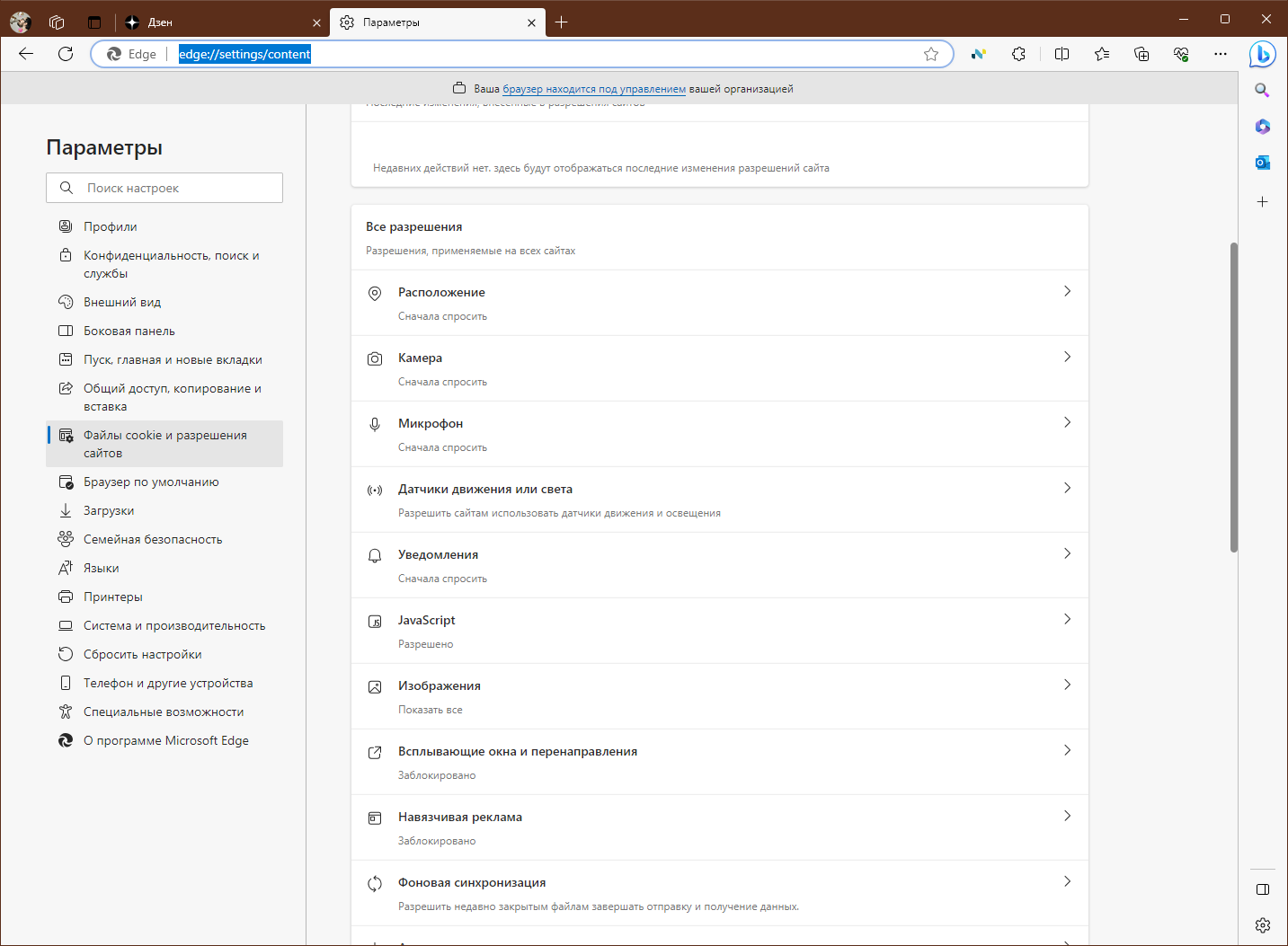 Здесь всё так же, как в Google Chrome. Перейдите в Параметры, затем в Файлы cookie и разрешения сайтов, или по ссылке edge://settings/content. В разделе Все разрешения вы сможете выставить настройки для каждого из них.