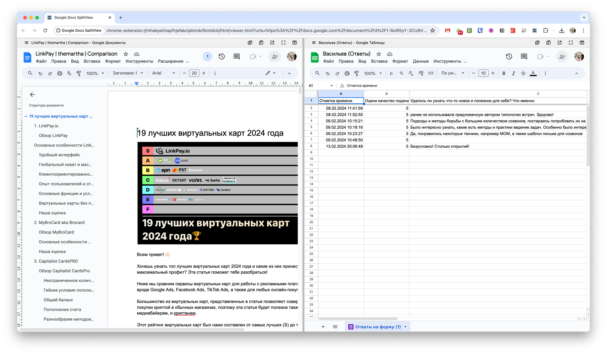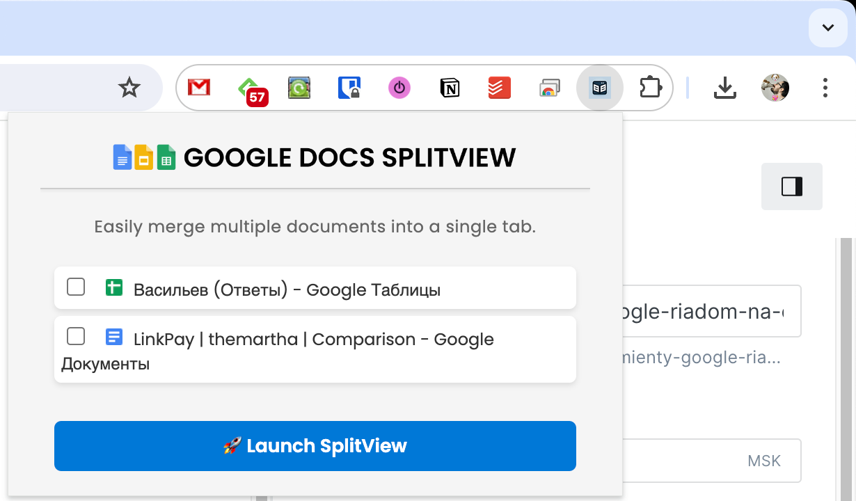 Или можно установить расширение Google Docs SplitView, которое позволит сделать это за один клик. От вас требуется открыть нужные доки и нажать на иконку расширения.