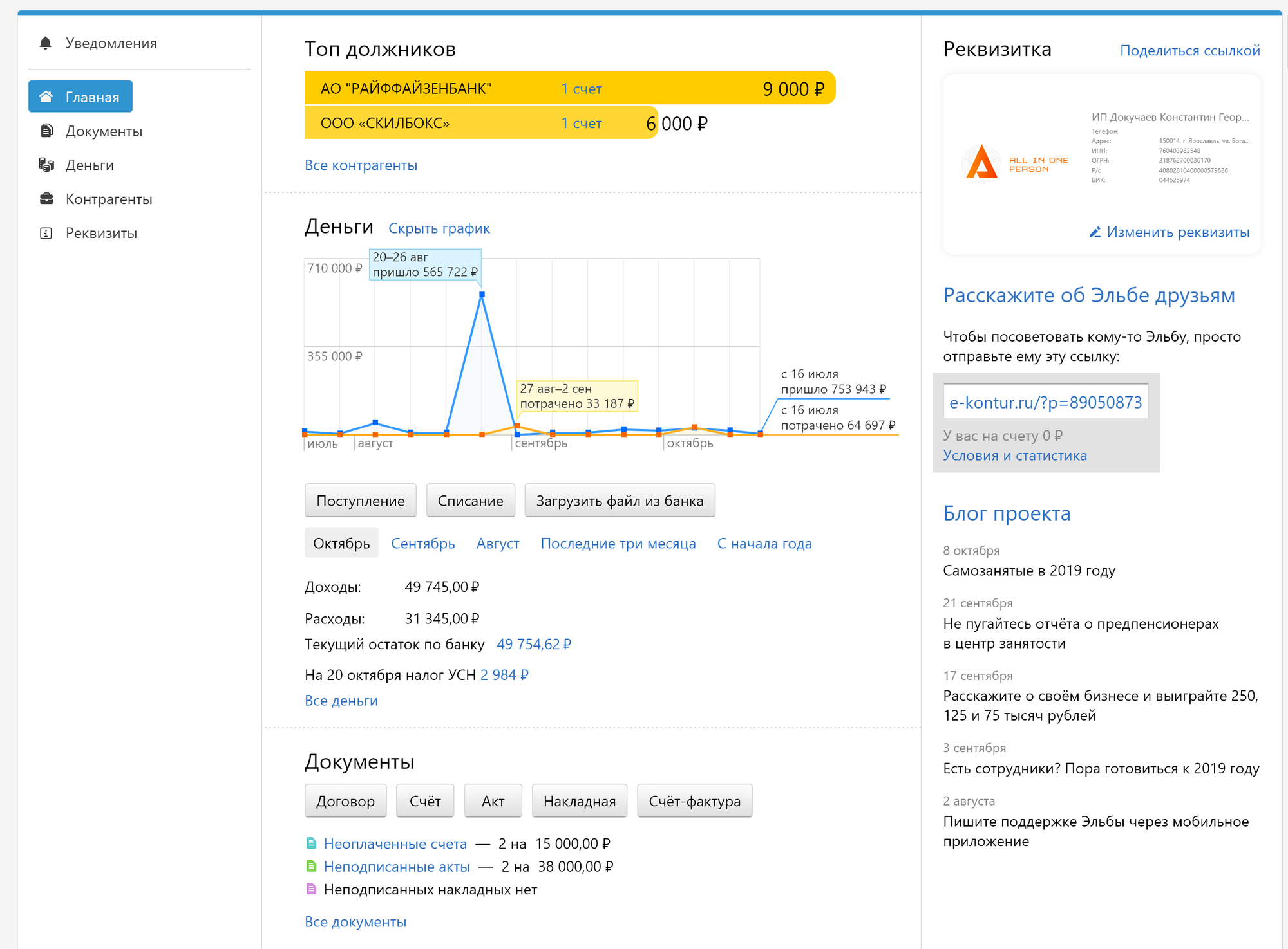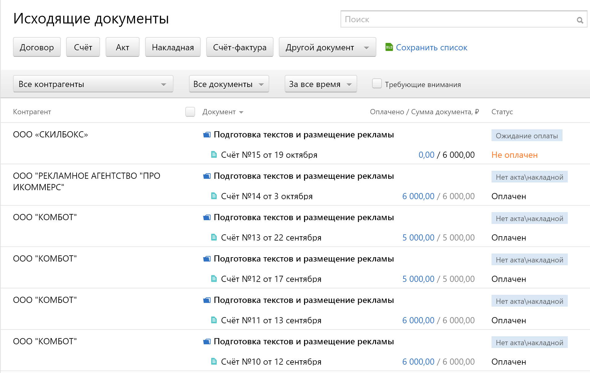 В целом для корректного завершения сделки может ещё понадобиться акт выполненных работ и договор. Все эти документы я делаю в «Контур.Эльба», там же их отслеживаю и храню.