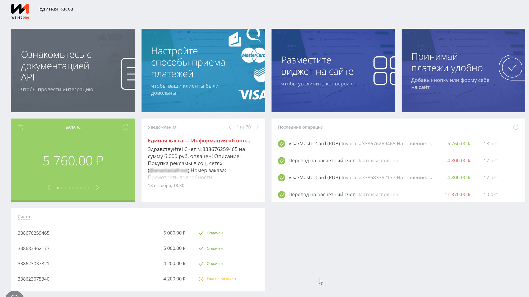 В итоге я выбрал эквайринг от «Wallet One». Единственный минус — большая комиссия за переводы. Я теряю до 5% на каждой оплате от клиента.