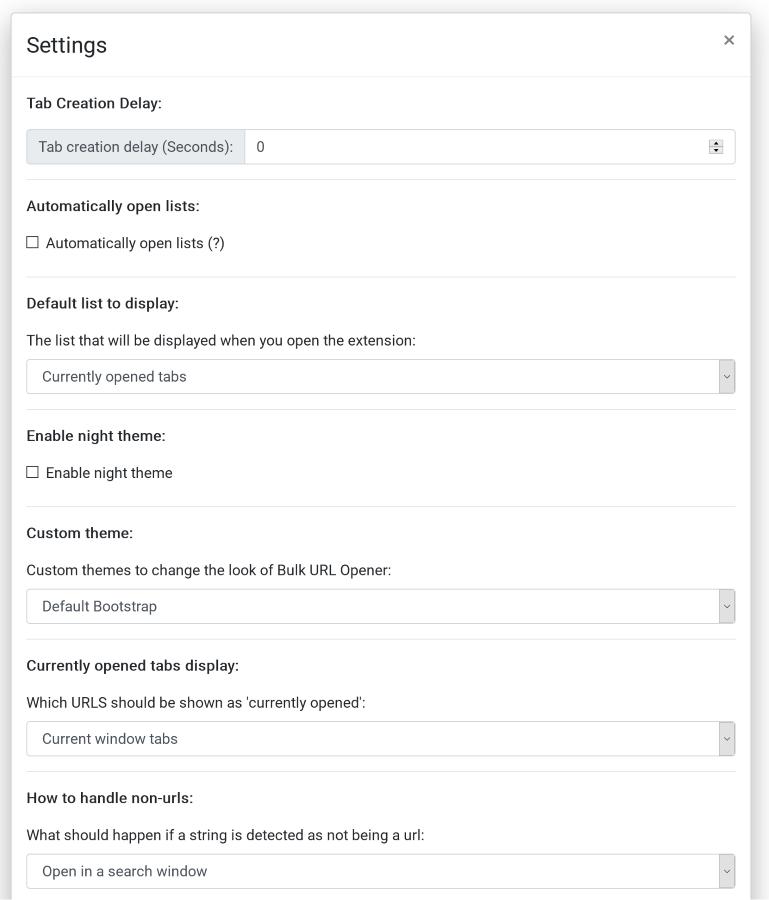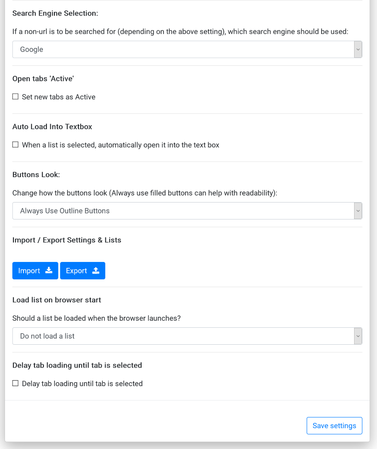 В настройках расширения можно указать поведение при открытии списков. Можно настроить время, через которое будут открываться новые вкладки. Указать автоматическое открытие ссылок из выбранных списков. Выбрать список по умолчанию, который будет открываться при вызове расширения. И многое другое.