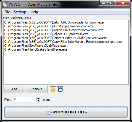 После добавления в список остаётся только нажать кнопку Open Multiple Files. Файлы будут открываться именно в том порядке, в котором они отображаются в списке. Для открытия также можно задать задержку в миллисекундах.
