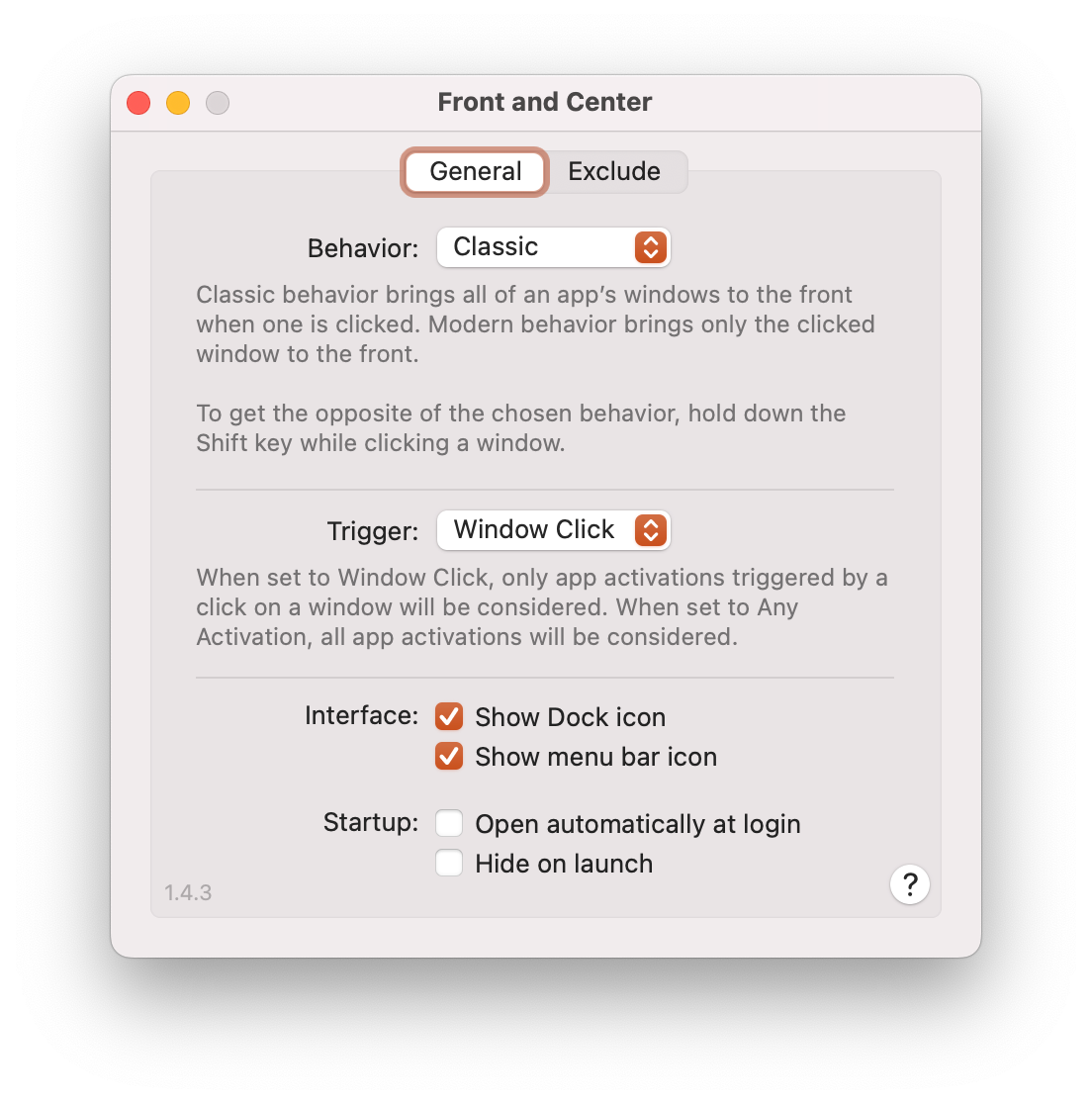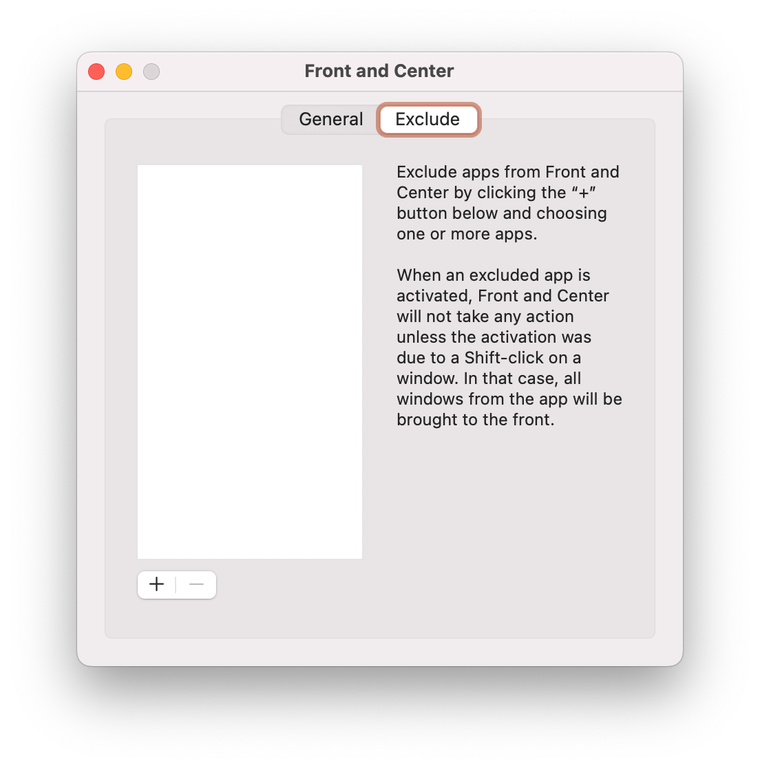 В разделе Exclude можно добавить приложения, которые будут игнорироваться Front and Center и всегда будут работать в классическом режиме. Если вы не зажмёте Shift при клике по окну.