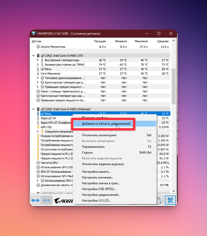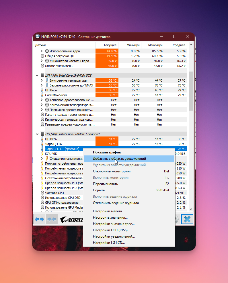 Далее названия пунктов могут отличаться в зависимости от вашего железа. Просто найдите что-то аналогичное пунктам ЦП Весь и GPU Весь, нажмите на каждый из них правой кнопкой мыши и выберите пункт Добавить в область уведомлений.