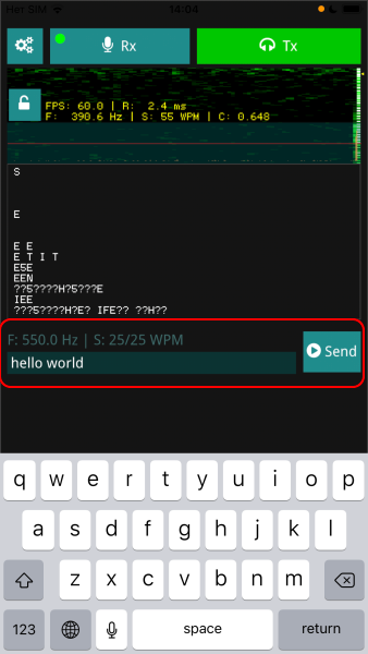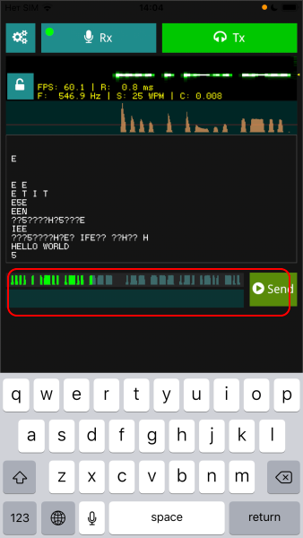 С другой вкладки можно отправить собственный сигнал. Для этого нужно ввести текст и нажать кнопку Send. После чего сразу же начнёт воспроизводиться сигнал Морзе.