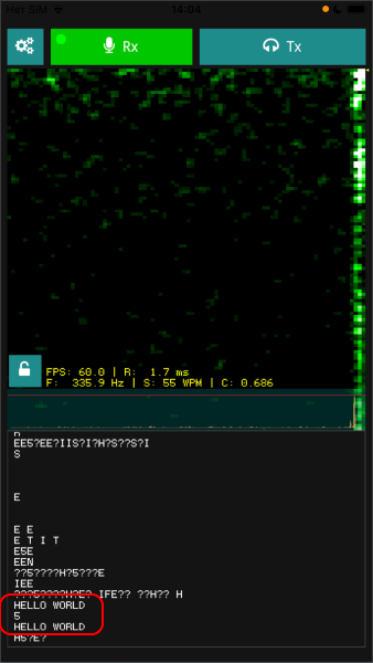 При запуске приложения вы можете запустить распознавание сигнала на специальной вкладке. Нажимать для этого ничего не нужно, GGMorse автоматически пытается распознать все слышимые звуки. Внизу выводится расшифровка сигнала.