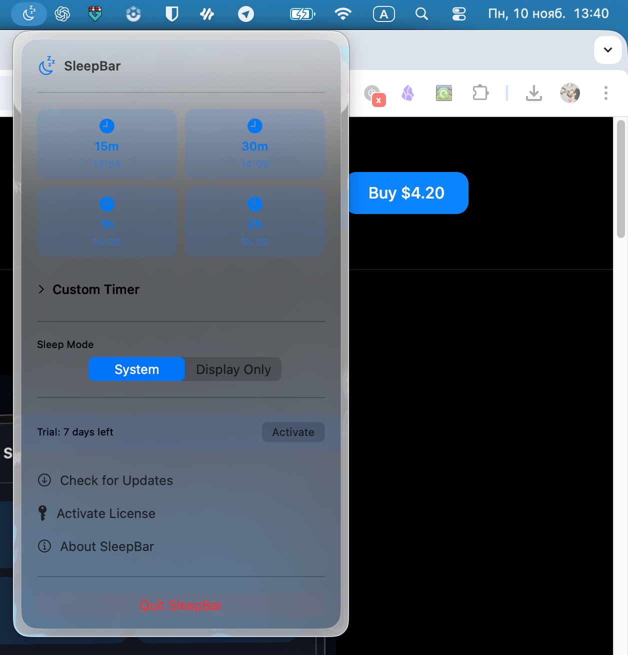 Попробовать SleepBar можно бесплатно в течение недели. Затем придётся приобрести лицензию за $4.20.