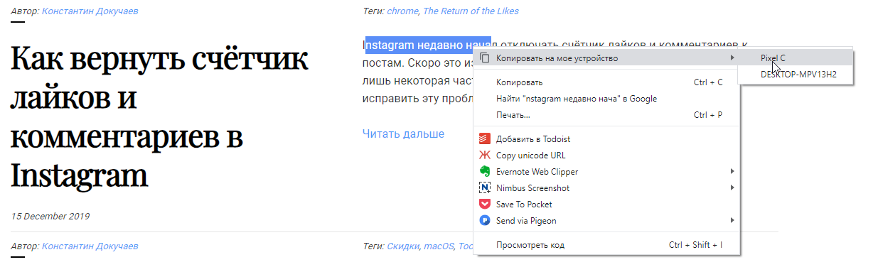 Для всех трёх флагов выставите значение Enabled и перезапустите браузер. Теперь в контекстном меню Chrome появилась опция отправки текста на все совместимые устройства: