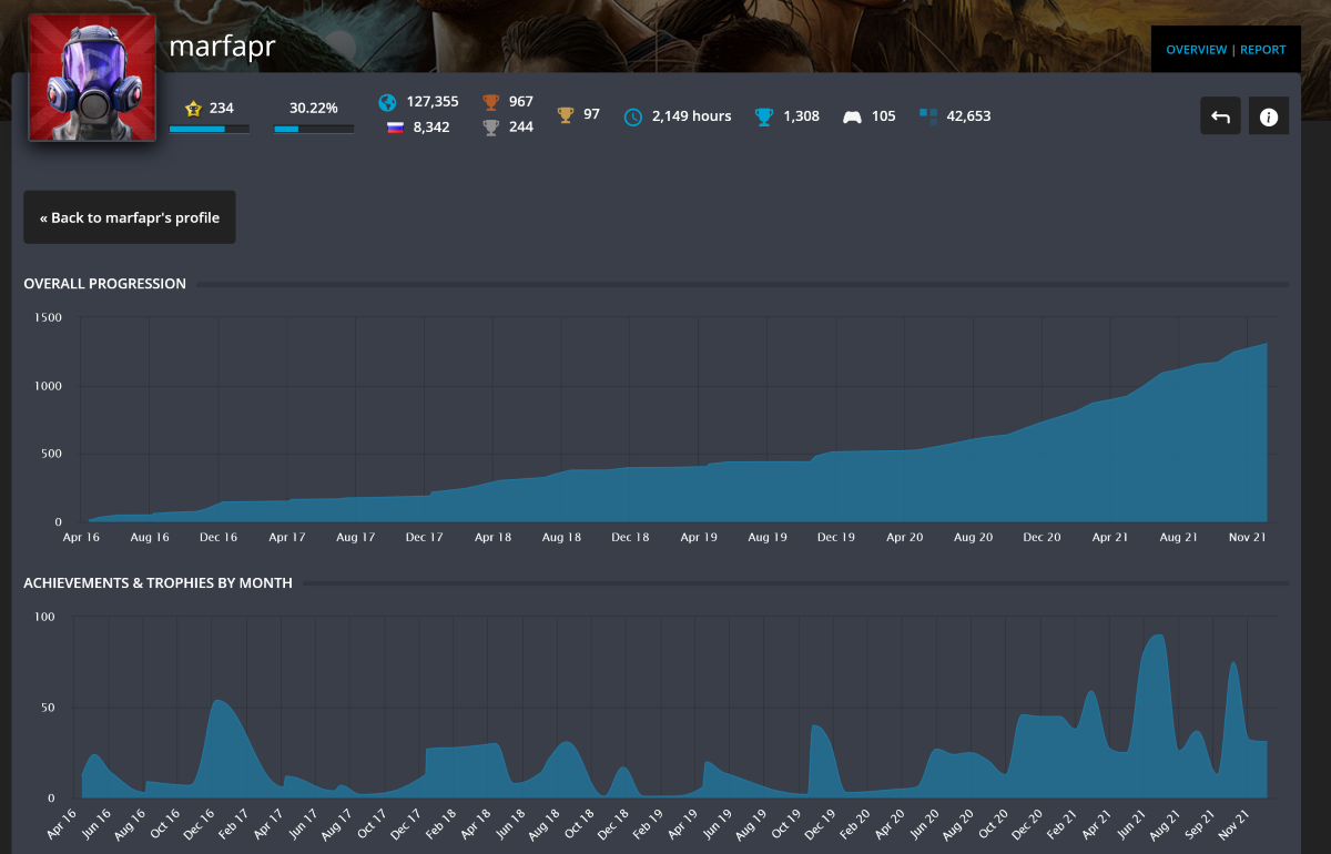 Здесь вы увидите сводную статистику вашего профиля, призы и время, проведённое в каждой игре.