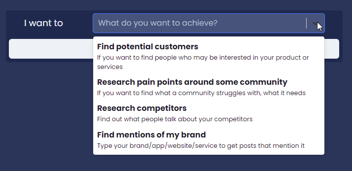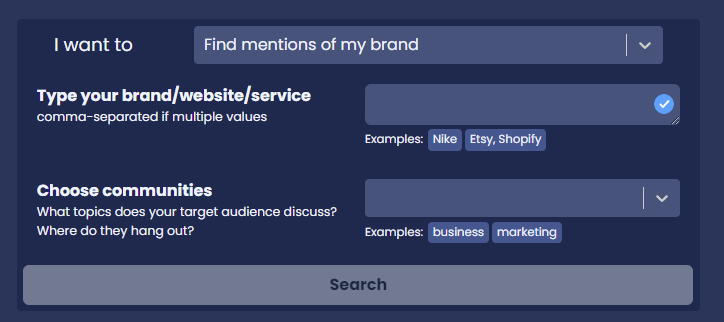 После авторизации в разделе Search Content нужно задать цель изысканий. Это может быть поиск потенциальных клиентов, нахождение проблем, исследование конкурентов или просто упоминания бренда.