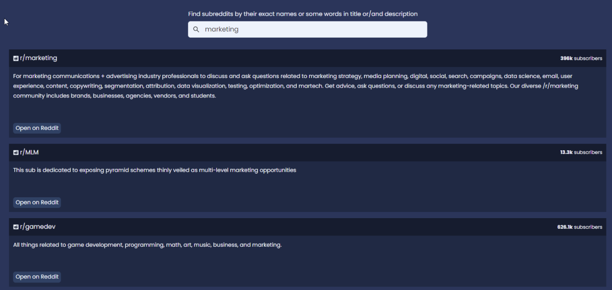 В разделе Subreddits search можно найти сообщества по нужной тематике. Просто укажите ключевое слово и получите список.