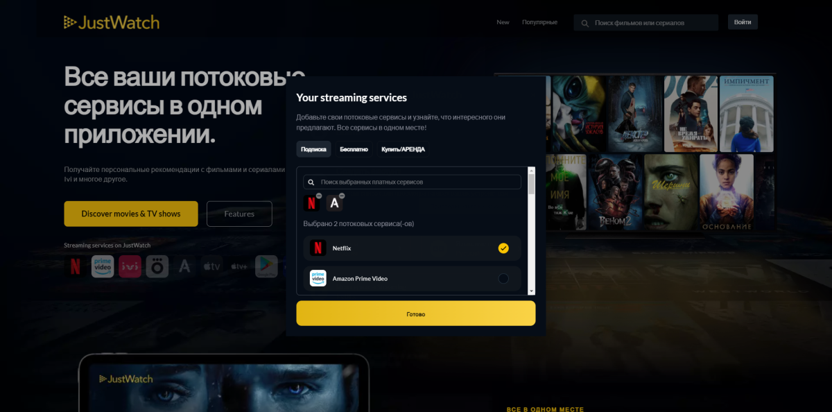 Ещё на этапе регистрации в нём, вы выбираете интересующие вас стриминговые платформы. При этом можно выбрать тип подписки: аренда, покупка или бесплатный просмотр.