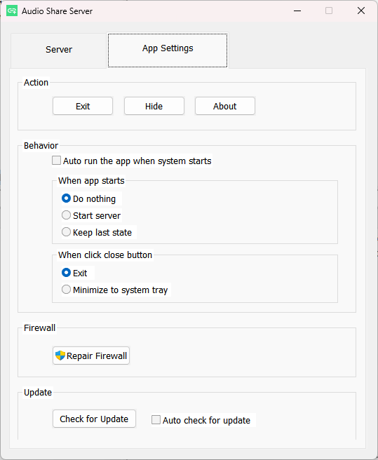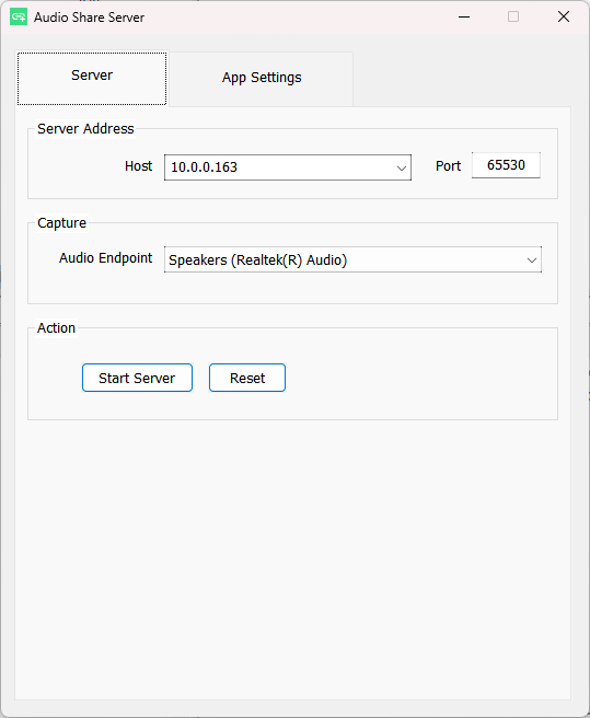 На десктопе настроек минимум. Выбираете адрес хоста и аудиовыход, а затем нажимаете Start Server для запуска стрима. При желании в настройках можно управлять параметрами автозапуска.