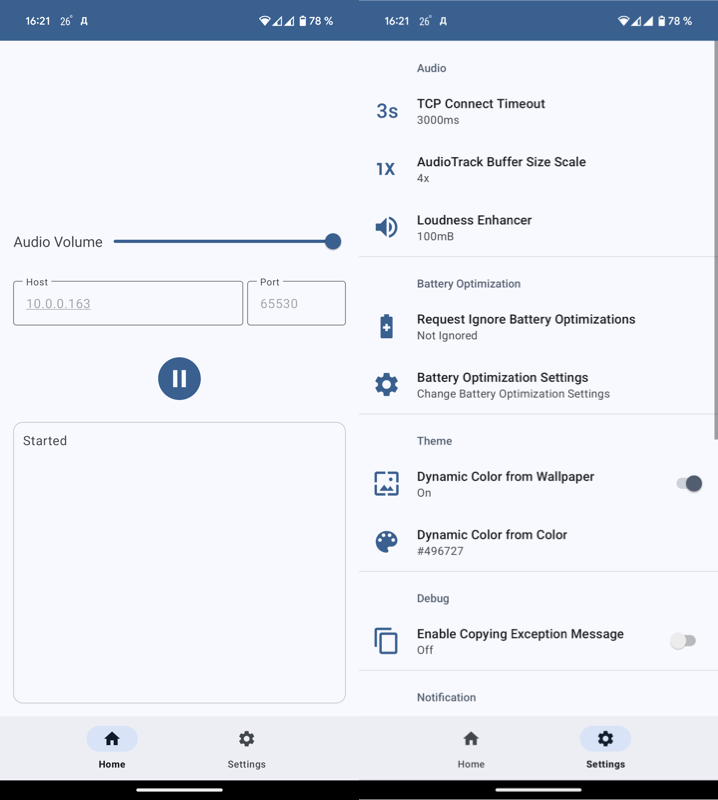 На Android нужно указать тот же адрес сервера и просто запустить приём аудио. При желании в настройках можно управлять параметрами таймаута, буферизации и прочими штукам.