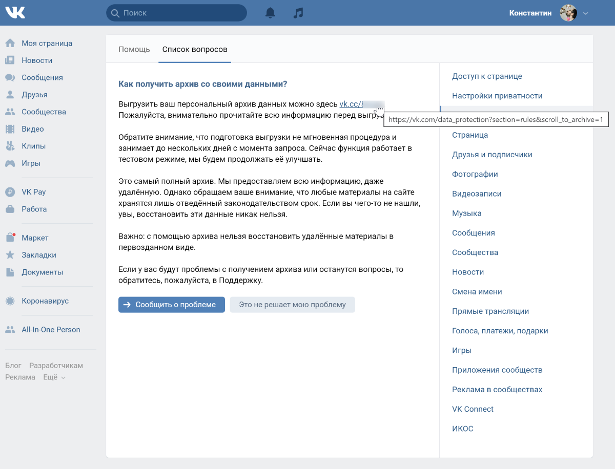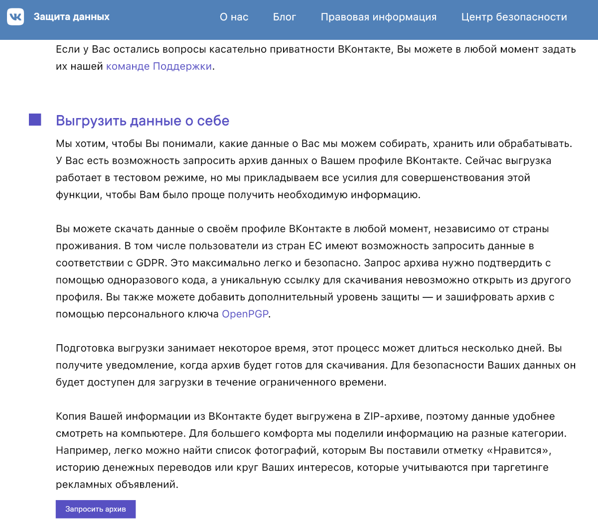 На следующей странице вы сможете запросить архив с данными о себе.