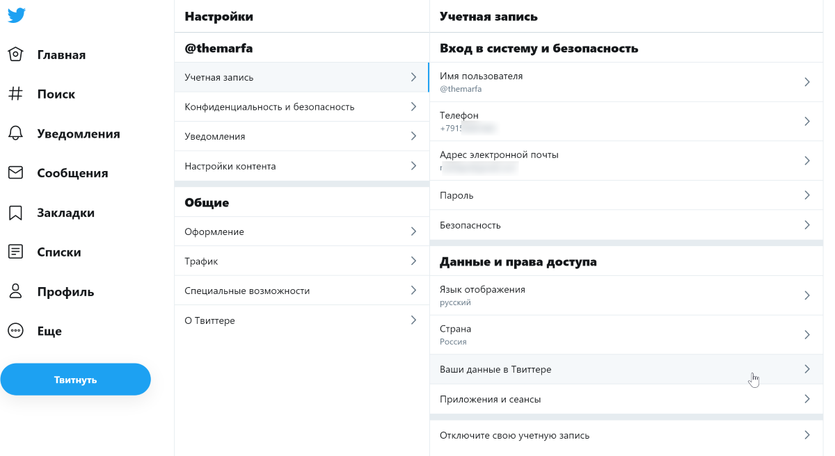 В разделе «Учетная запись» перейдите в пункт «Ваши данные в Твиттере».
