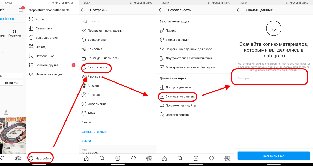 Затем перейдите в раздел «Безопасность», далее в «Скачивание данных». Укажите вашу почту и на неё придет архив с вашими данными.