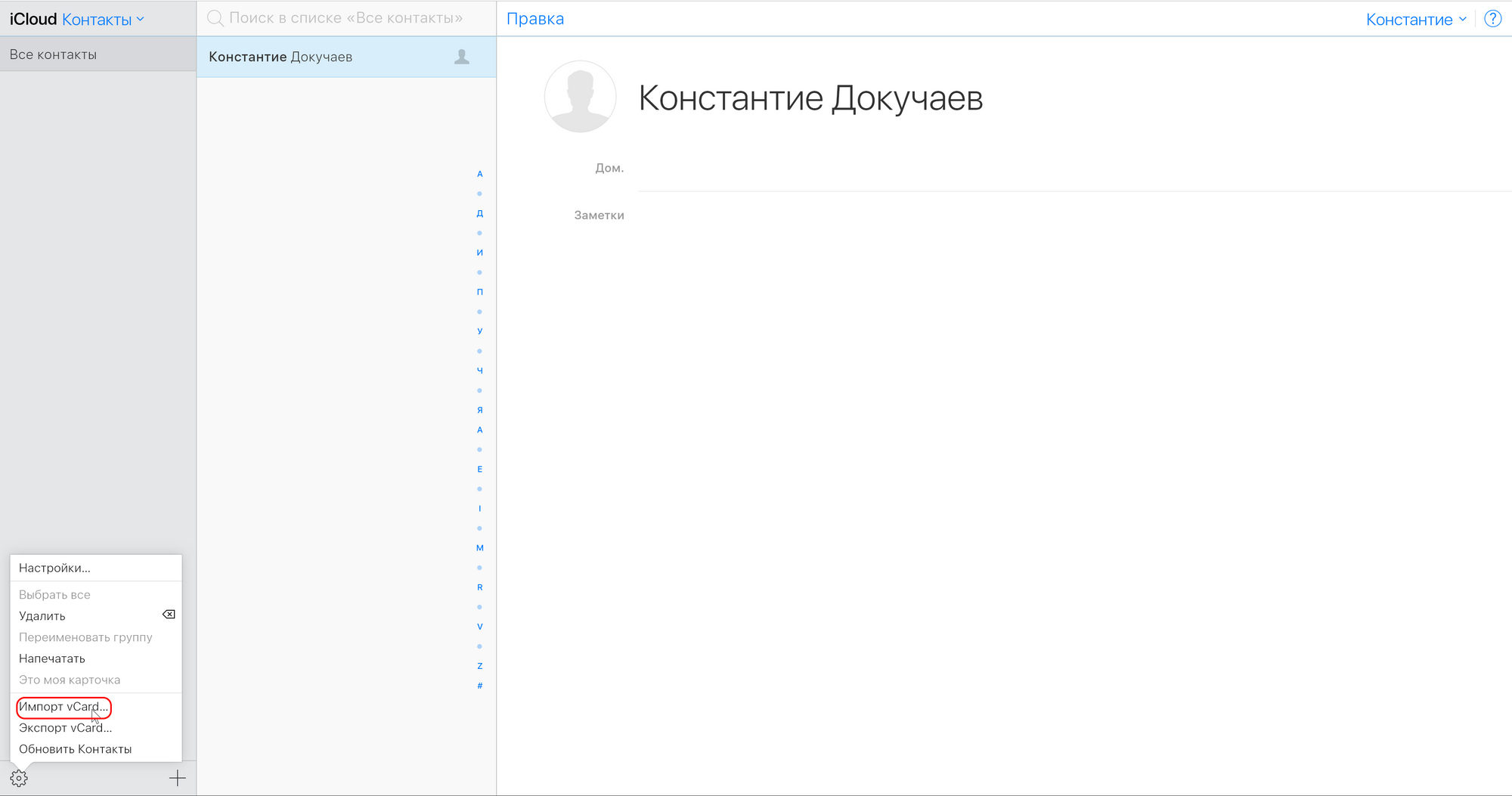 - Нажмите на кнопку Настроек и выберите Импорт vCard