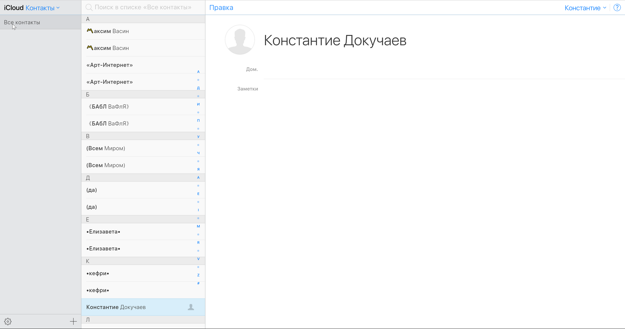 - В появившемся окне можно выбрать группу контактов или выбрать все контакты. Выберите пункт «vCard (для приложения "Контакты" на устройствах iOS)» и нажмите Экспортировать: