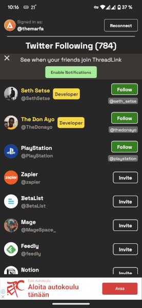 ThreadLink – мобильное приложение, которое помогает найти аккаунты твоих подписок из Twitter в Threads. Процесс довольно простой: нужно указать свой юзернейм в Threads и авторизоваться в приложении через Twitter. После чего ты увидишь список найденный совпадений, а остальным можно отправить инвайт.
