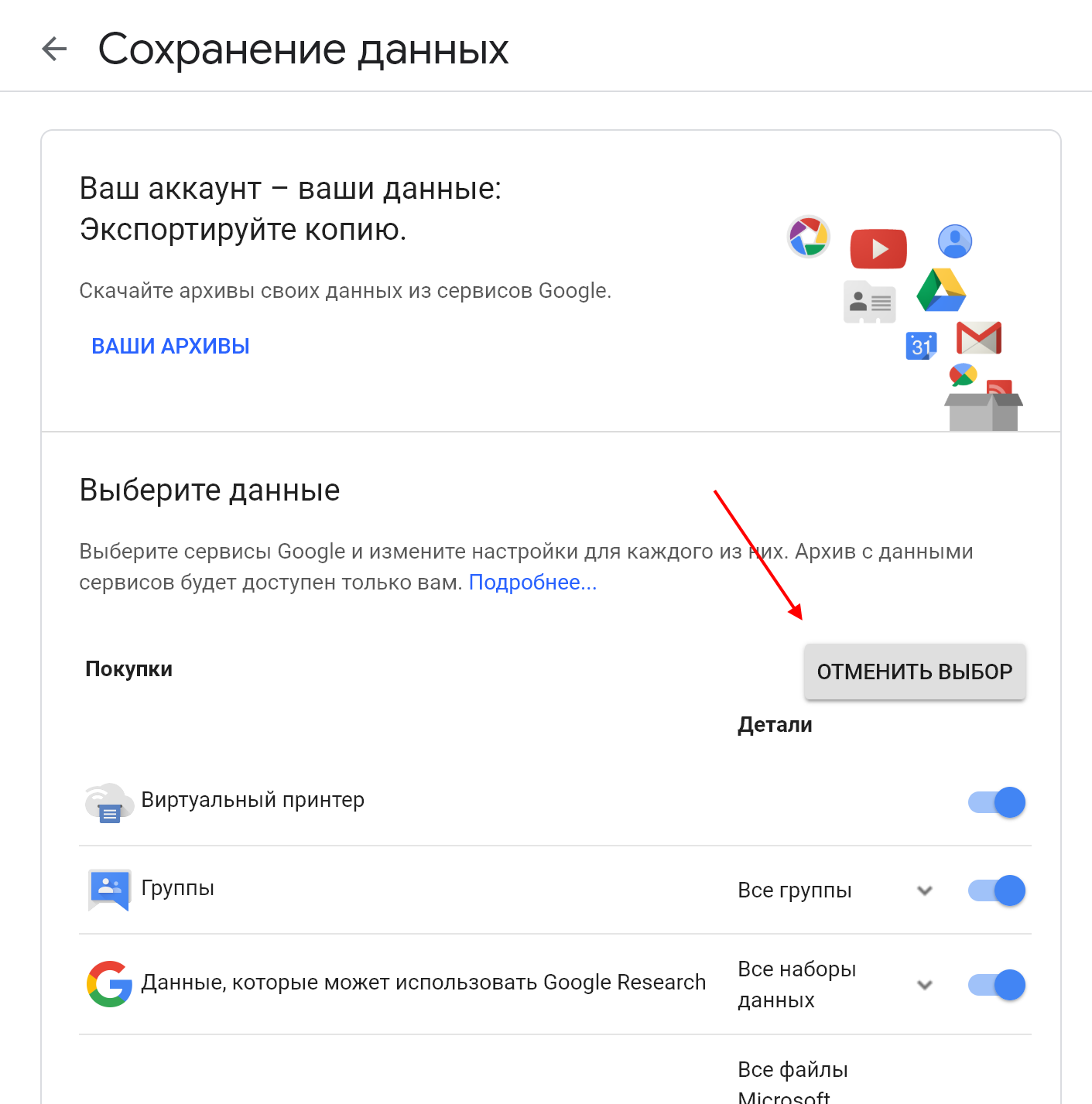 Чтобы забрать заметки из Google Keep, перейдите на сайт «Сохранения данных» и нажмите кнопку «Отменить выбор», чтобы не загружать все данные.