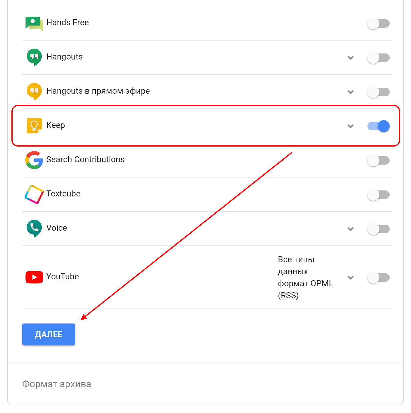 Теперь прокрутите вниз до пункта «Keep», включите тумблер и нажмите кнопку «Далее».