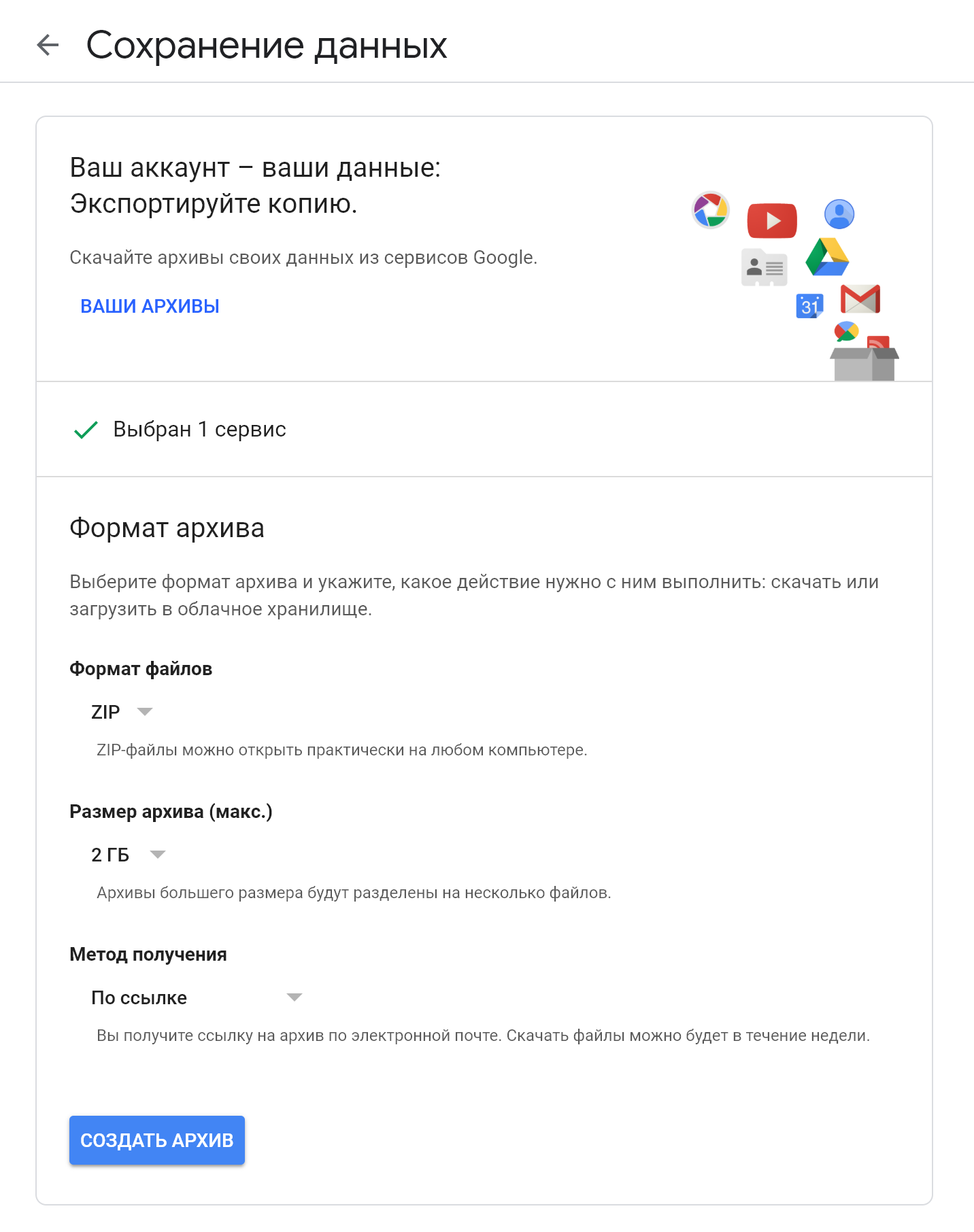 У Google уже давно существует официальный способ забрать все свои данные в удобном формате. Называется он Google Takeout (по-русски — Сохранение данных).