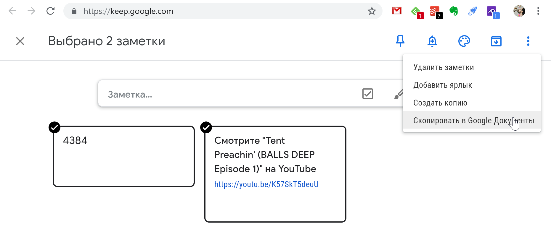 Откройте Google Keep в браузере при помощи CTRL+A, выделите все заметки, выберите в меню пункт «Скопировать в Google документы».