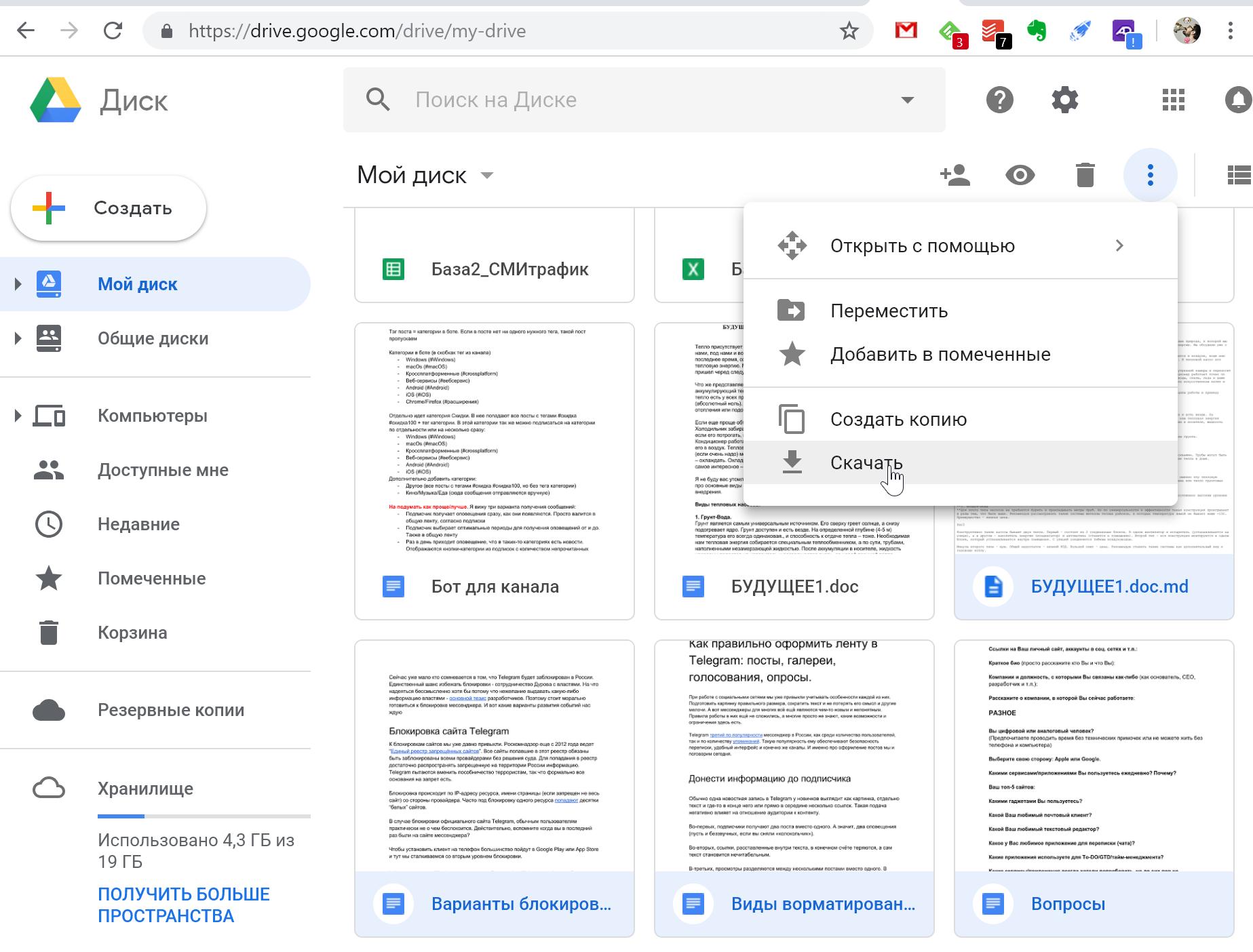 Теперь в Google диске можно выбрать все документы, и выбрать формат, в котором их скачать на компьютер. Эти файлы можно сохранить в Evernote.