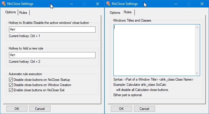 NoClose — автоматически отключает кнопку закрытия в определённых окнах. Кнопку можно показать/скрыть по горячей клавише.