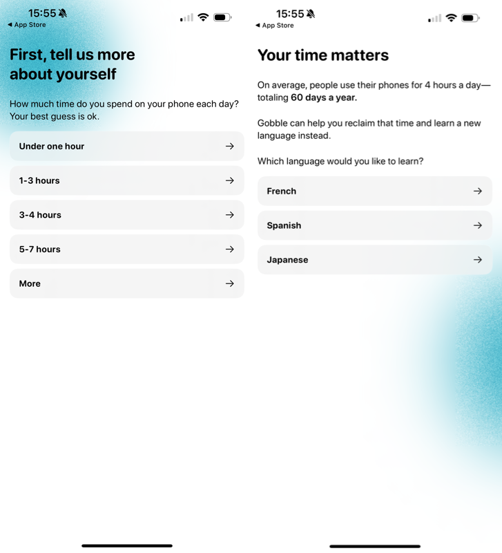Реализовано это благодаря интеграции со встроенной фишкой iOS Экранное время. Для этого при первом запуске вам нужно выбрать, сколько времени вы проводите за телефоном в течение дня и какие языки вы хотите учить.