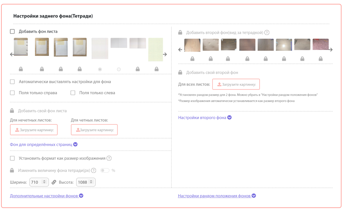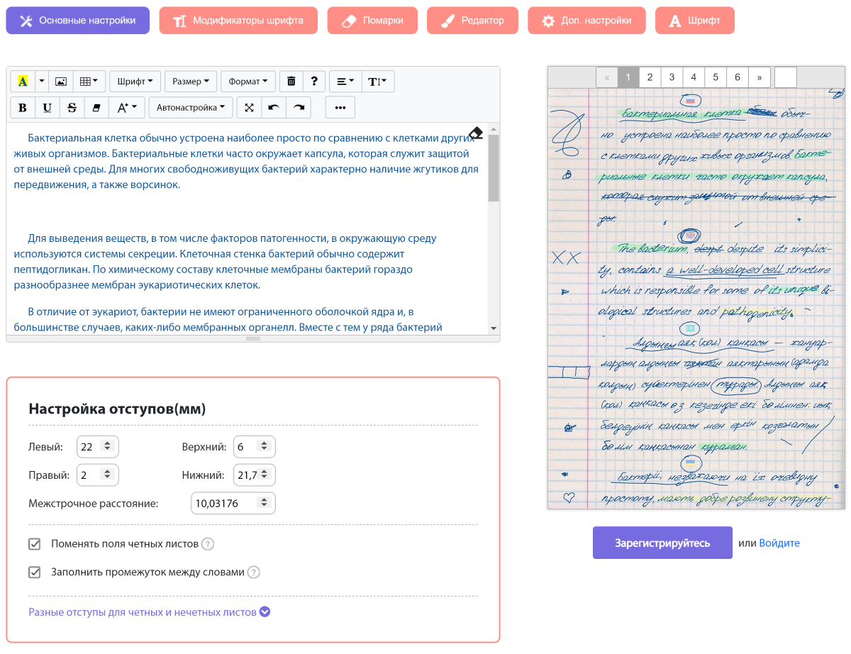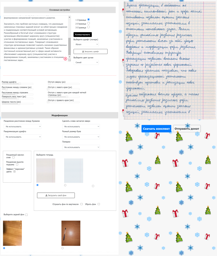 При этом разработчики не забыли, для чего создавался сервис. Поэтому дополнительно можно вносить различные модификаторы текста, добавлять помарки и многое другое. Также есть множество встроенных фонов в виде тетрадных листов и возможность загружать свои фоны.