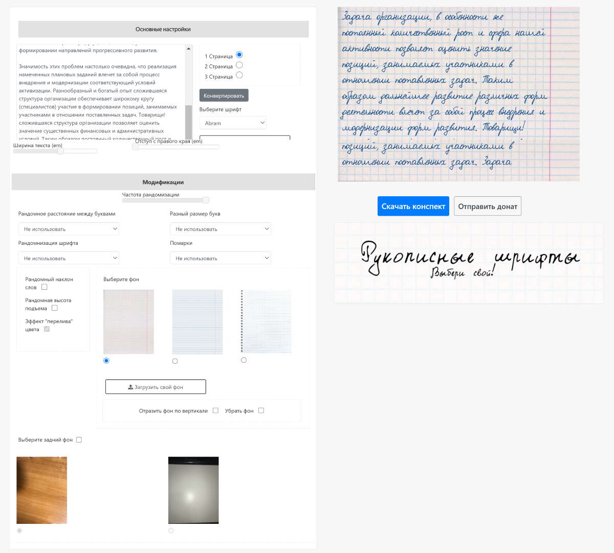 Можно настроить фон листка с текстом и сами шрифты. Для этого в handwrittner есть множество различных параметров, как в обычных текстовых редакторах.