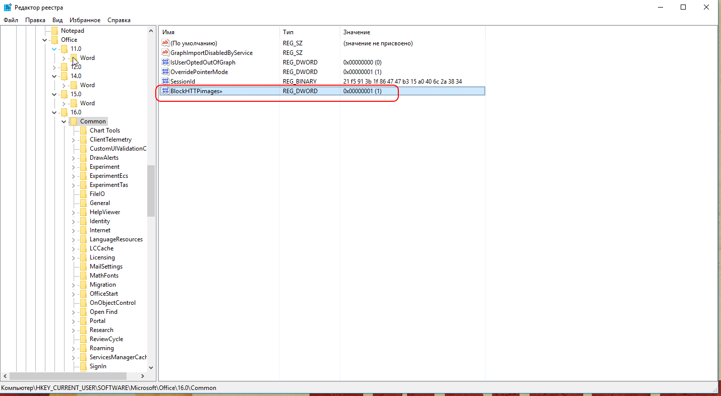 Не помогло? Откройте Пуск > Выполнить и наберите «regedit». Здесь откройте раздел «HKEY_CURRENT_USER\Software\Microsoft\Office\x.0\Common» и найдите параметр DWORD с названием «BlockHTTPimages» и значением 1. Удалите его.