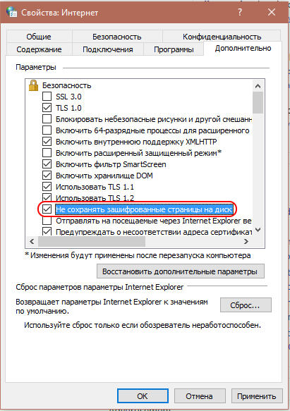 Решения здесь может быть три. Первое — откройте пункт «Сеть и Интернет» в Панели управления и нажмите «Свойства браузера». В появившемся окне откройте вкладку «Дополнительно» и активируйте пункт «Не сохранять зашифрованные страницы на диск». По идее, это всё, что нужно для решения проблемы.