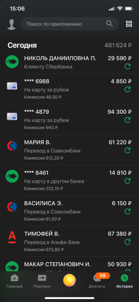 - Тип перевода (в Сбер, в Альфу, в Тинькофф, на карту, пополнение, пополнение в банкомате, входящий платёж Visa);