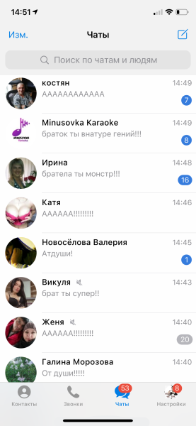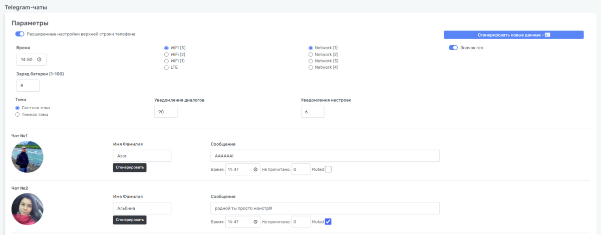 В этом разделе можно сгенерировать список пользователей и их сообщения, вплоть до указания времени отправки сообщения. Отдельно можно указать количество непрочитанных сообщений у контакта или «замьютить» пользователя.