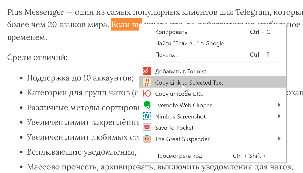 Более простой способ – установить расширение Link to Text Fragment от Google. В этом случае нужно просто выделить текст, нажать правой кнопкой мыши и выбрать пункт Copy Link to Selected Text.
