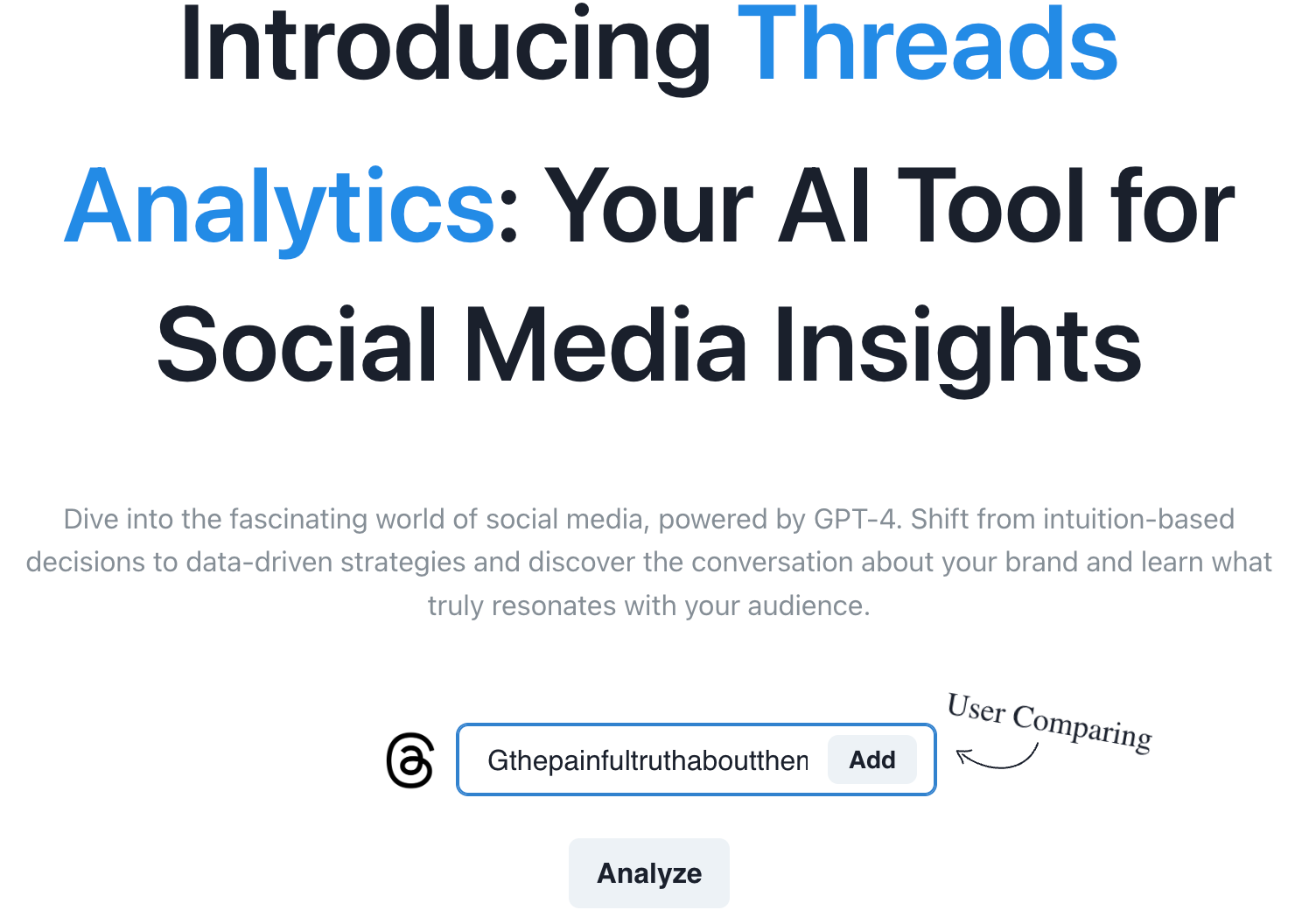 С помощью сервиса можно собрать данные не только по своему, но и по любому другому аккаунту в Threads. Для этого достаточно на главной странице указать его юзернейм и нажать кнопку Analyze.
