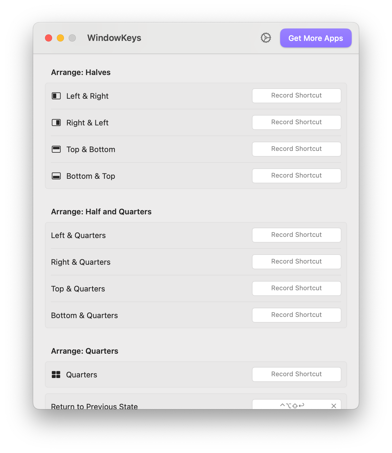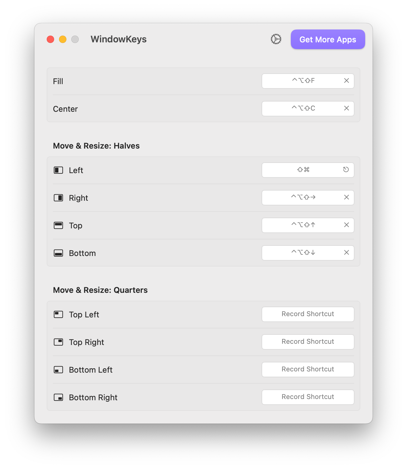 Она создана именно для решения проблемы расположения окон в правильных углах экрана с помощью сторонних клавиатур. В настройках нужно выбрать необходимое действие и нажать любую комбинацию клавиш.