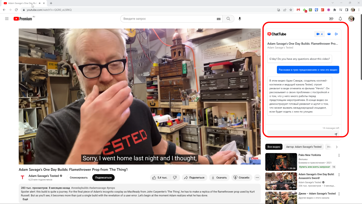 Это легко осуществит с помощью расширения ChatTube, которое позволяет в реальном времени задавать ChatGPT вопросы о текущем ролике на YouTube. Правда это будет работать только на видео с титрами на английском, но вопросы можно задавать и на русском языке.