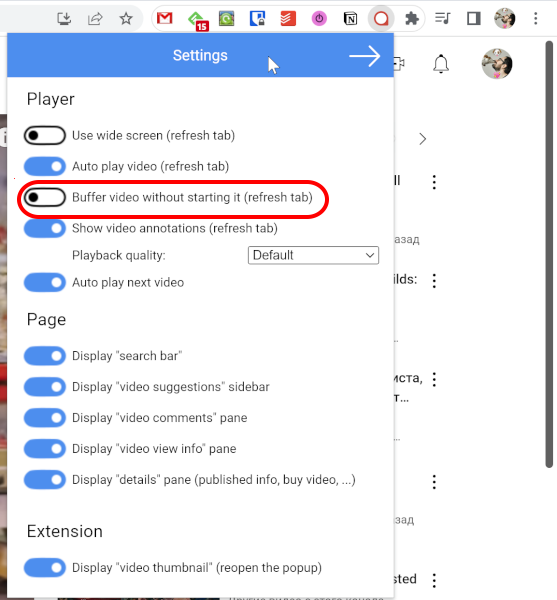 Для этого запустить ролик и перейдите в настройки расширения. Здесь вы найдёте несколько полезных параметров, но нас интересует Buffer video without starting it.