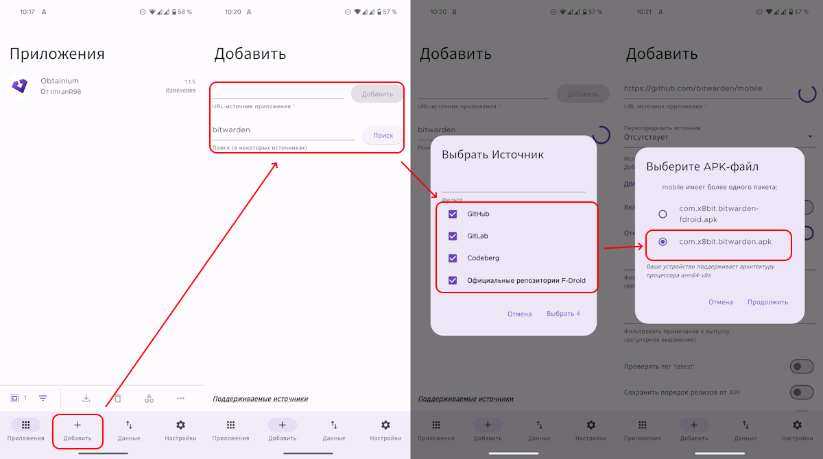 Чтобы сделать это, нужно нажать кнопку Добавить, а затем указать прямую ссылку на источник, либо воспользоваться поиском. В первом случае, если всё сделано правильно, вы сразу же попадёте на экран выбора приложения. Во втором — дополнительно нужно указать, в каких репозиториях искать приложение, и затем уже выбрать файл с APK.