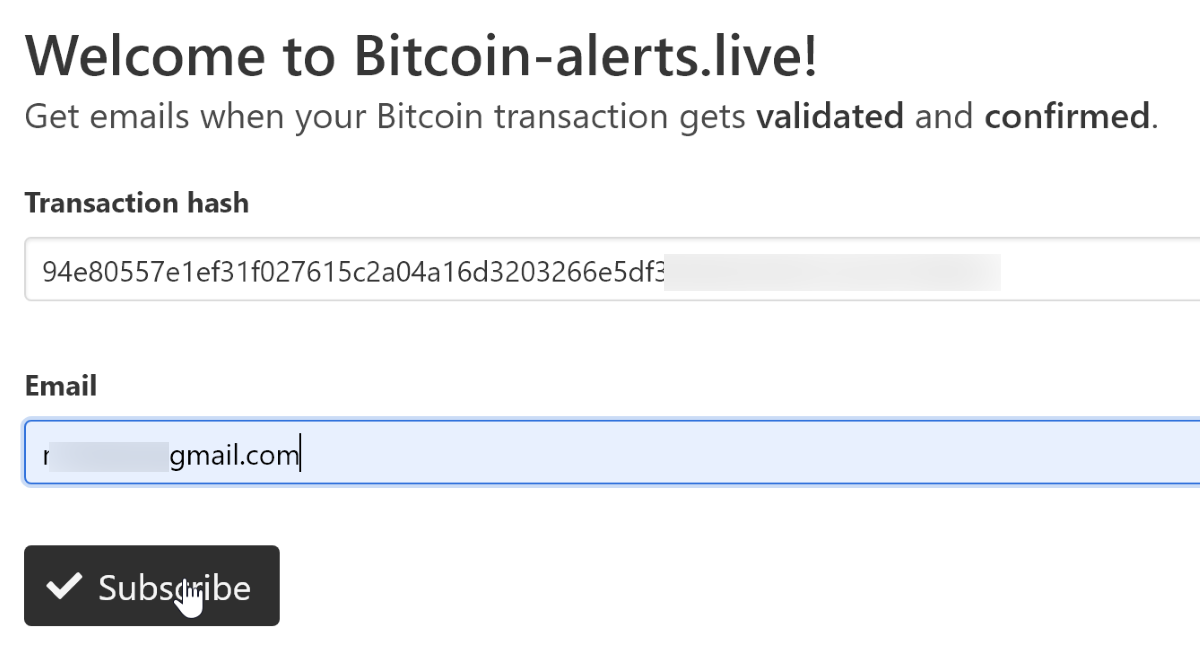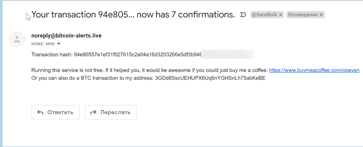 Недавно я перевёл деньги на Bitcoin кошелёк и получение первого подтверждения транзакции заняло почти шесть часов. За это время задумался, было бы круто получать оповещения о том, что транзакция прошла.