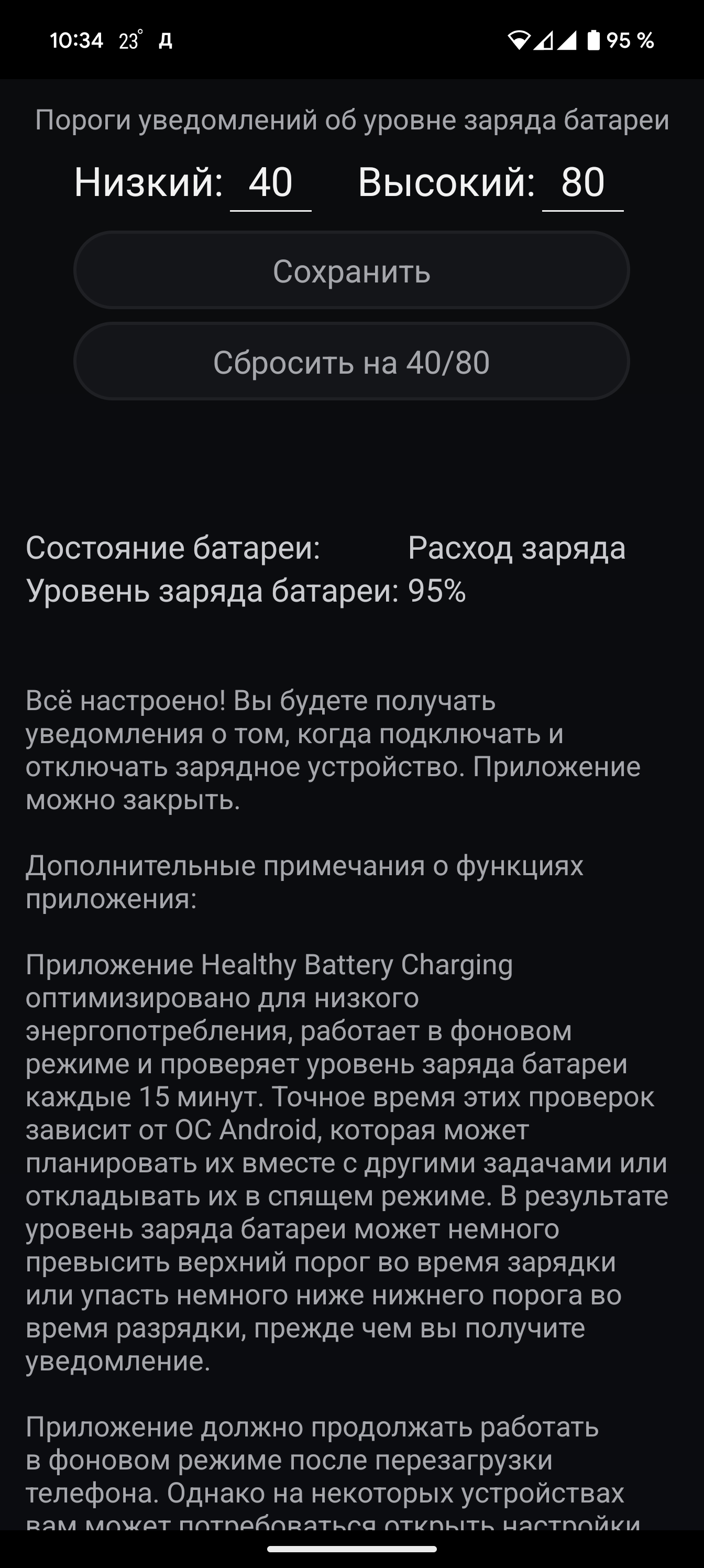 Если вы хотите получать оповещения при достижении определённого уровня заряда батареи, то можно установить приложение Healthy Battery Charging. Настроек в нём немного, достаточно просто указать минимальный и максимальный желаемый уровень заряда.
