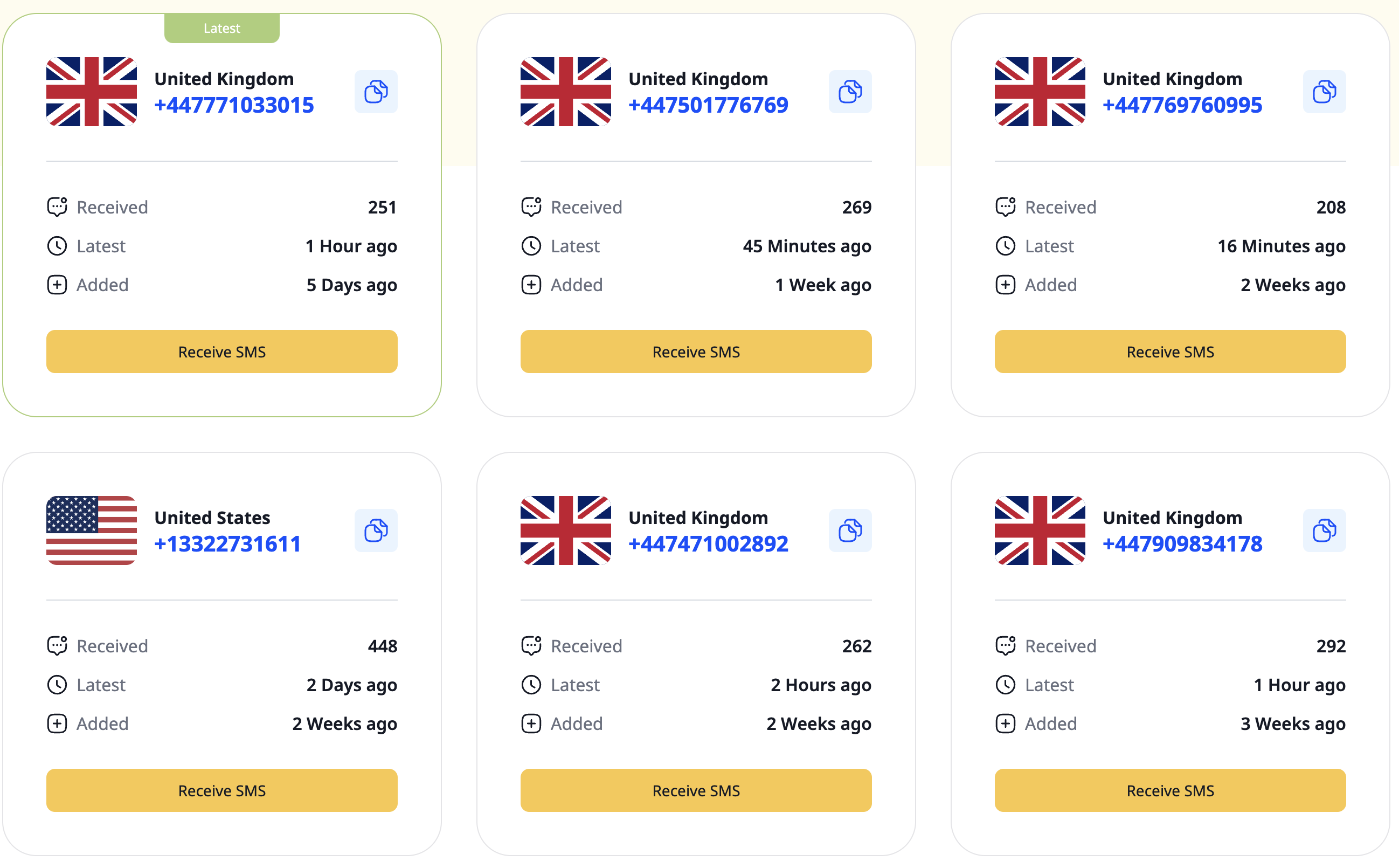 На главной странице сайта можно выбрать один из номеров телефона и просто скопировать его и указать при регистрации. А при нажатии на Receive SMS вы попадёте в историю СМС-сообщений номера, где сможете увидеть и ваш код.