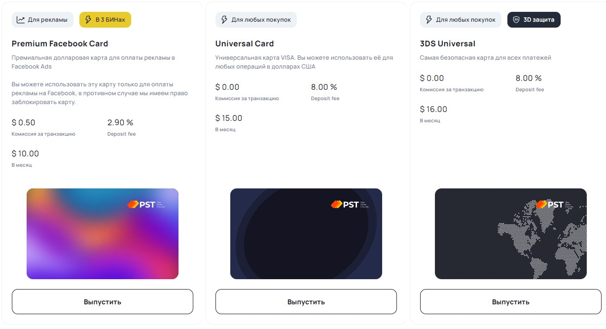 Есть несколько типов карт Visa и Mastercard банков США и Европы с надежными BIN. Карты пополняемые, но не все из них поддерживают 3D Secure коды. Часть карт рассчитана только на пополнение рекламных кабинетов зарубежных площадок. Для оплаты товаров подойдут карты Universal Card и 3DS Universal.