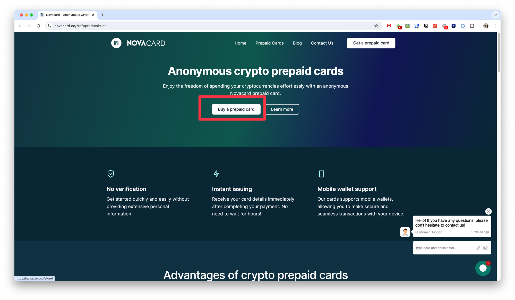 Для получения карты не потребуется прохождение KYC, и чтобы начать её выпуск, просто нажмите кнопку Buy prepaid card на главной странице сайта.