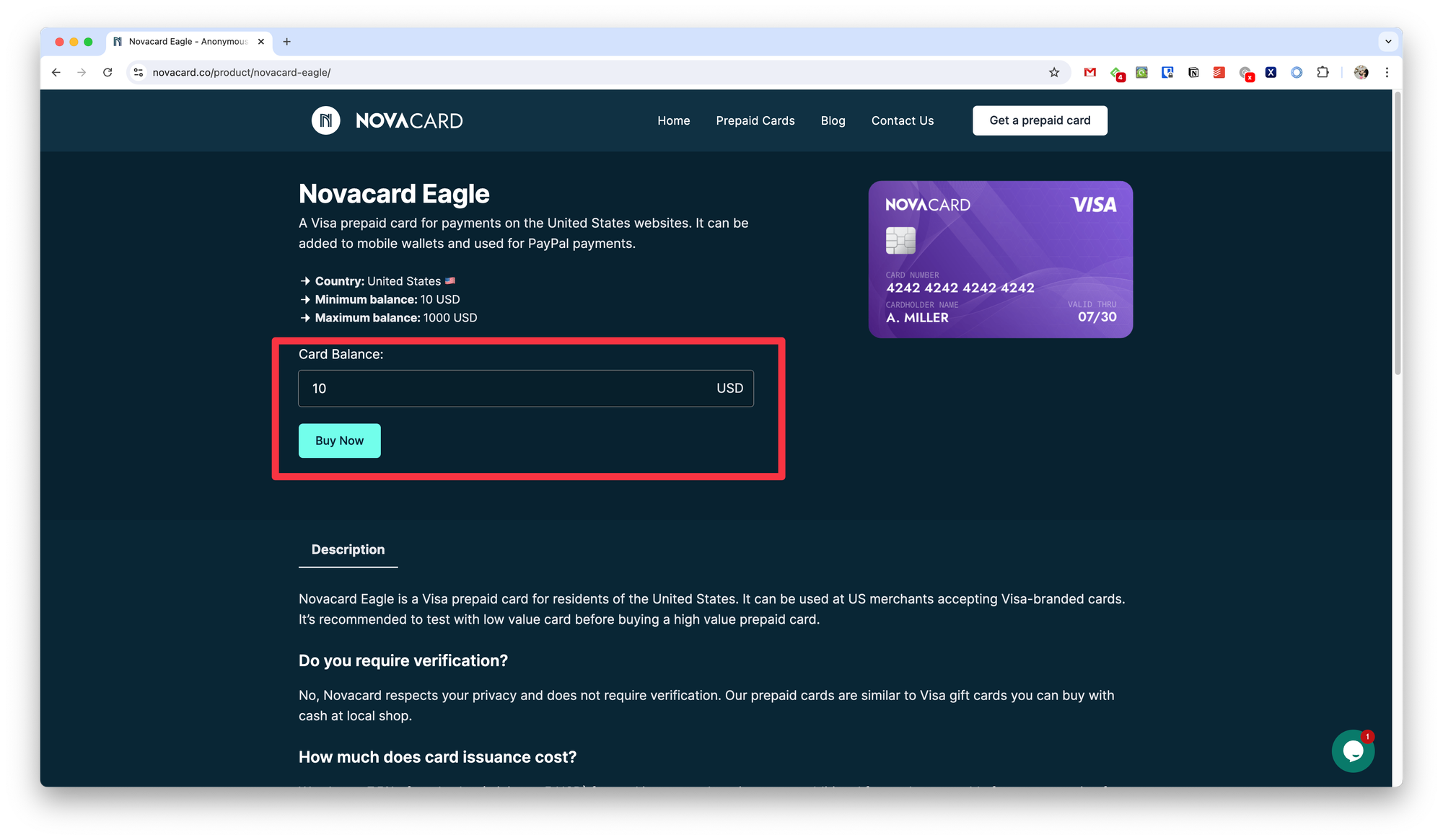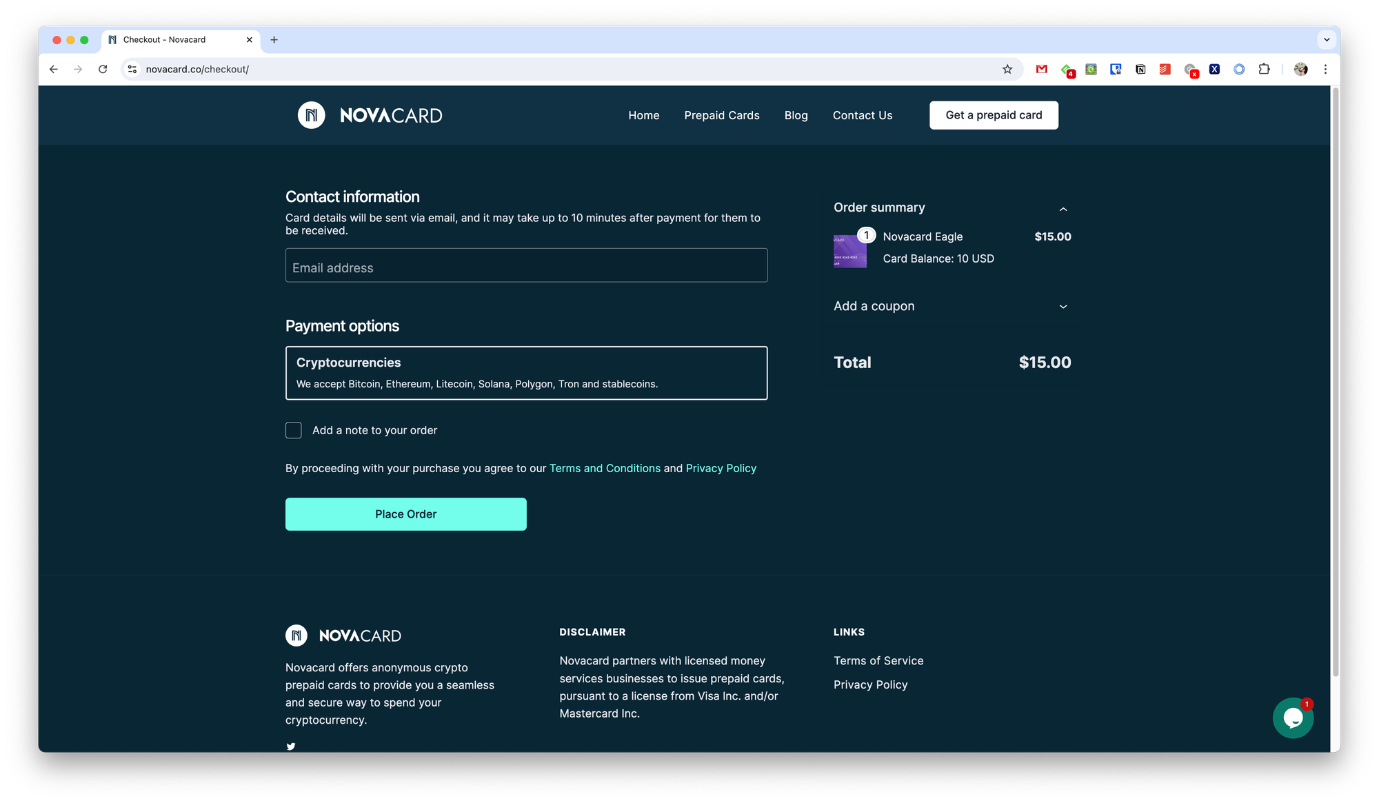 В этот раз я решил взглянуть на сервис Novacard, который обещает выпустить карту сразу после оплаты криптой и без подтверждения вашей личности.