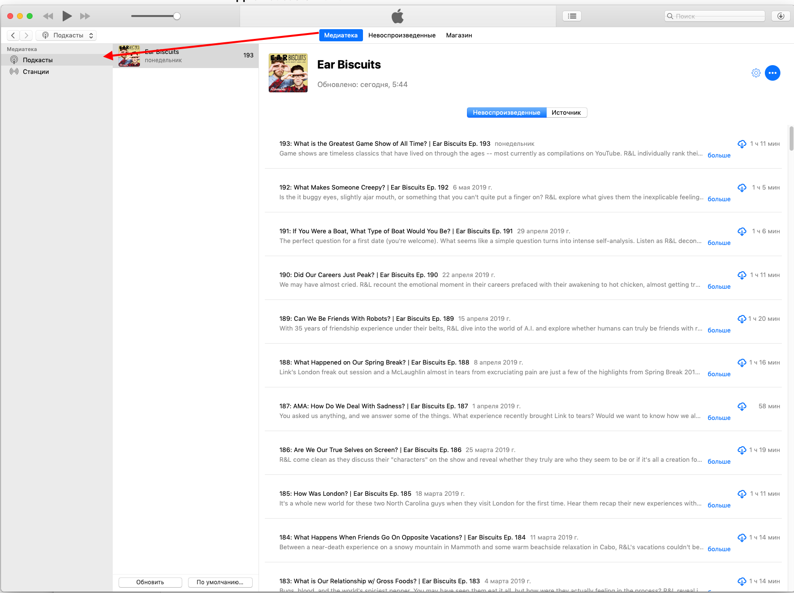 Для начала надо быть подписанным на подкаст, для которого вы хотите получить RSS-ленту. Затем запустите iTunes, перейдите в медиатеку и выберите подкасты.